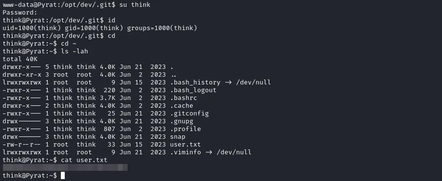 In the `/opt` directory, we notice the `/dev` folder. This in turn has a `.git` folder. We have a repository here. We check the config and find a password for the username `think`.